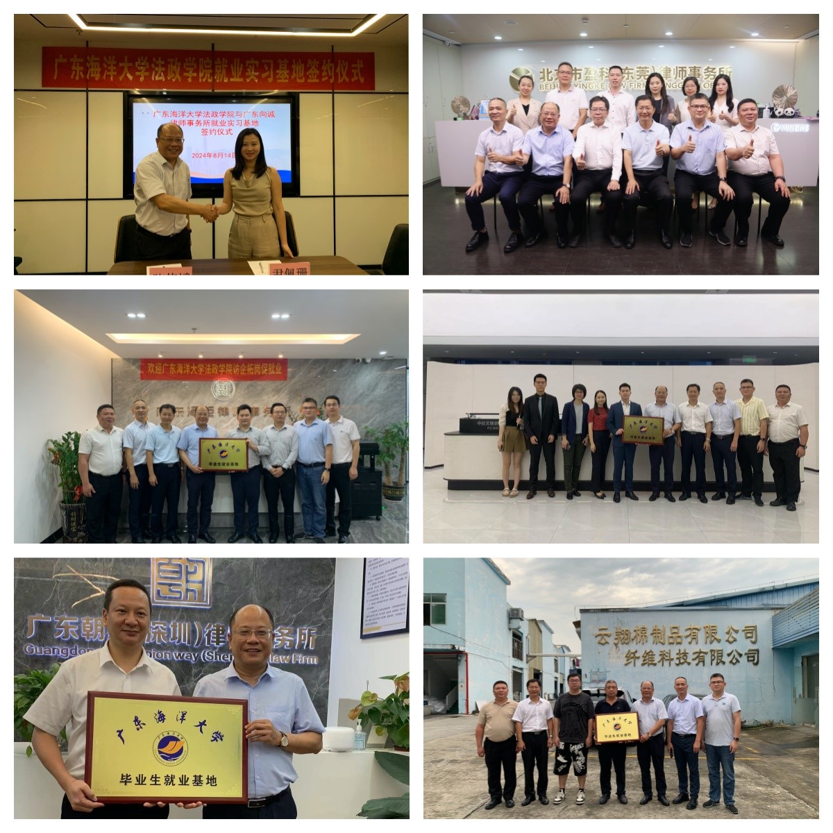 党委书记林忠新、院长陈伟斌一行人等前往深圳、东莞等地走访了中伦文德胡百全(前海)联营律师事务所、广东泽钜律师事务所、广东朝胜(深圳)律师事务所、广东向诚律师事务所、北京市盈科(东莞)律师事务所、东莞市云翔棉制品有限公司,与单位负责人进行了座谈并签订协议建立毕业生就业基地。