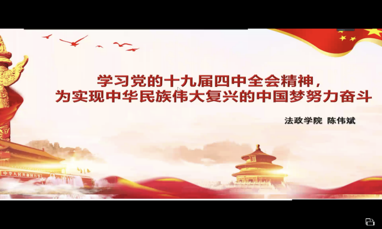 “思政第一课”由学院党委书记陈伟斌教授和院长张显伟教授在钉钉平台“云端”开讲,全院学生党员、发展对象、入党积极分子共计400多人次参加,法学专业学生党支部书记卢灿丽主持。