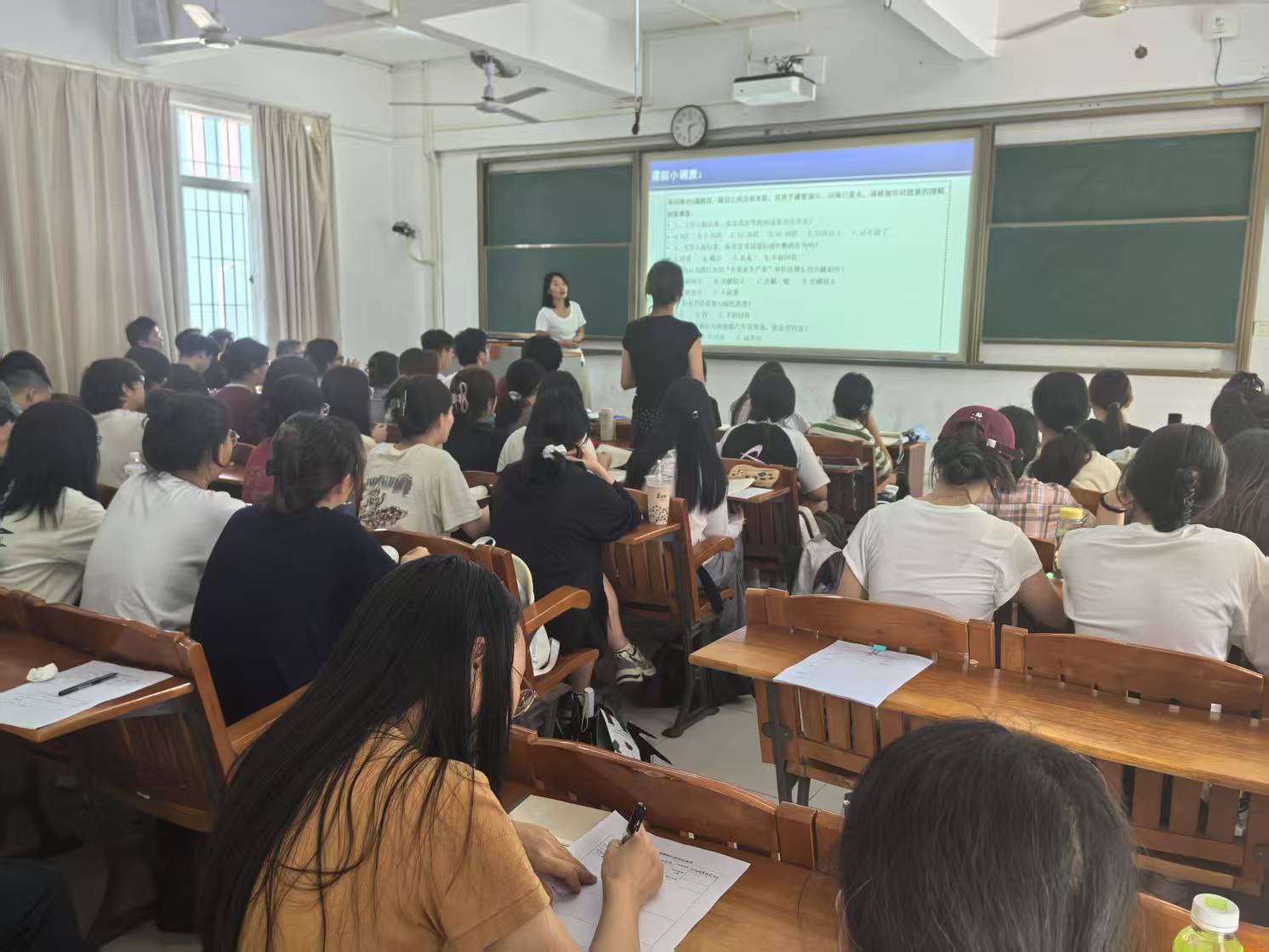 教师队伍建设,发挥优秀教师的教学示范引领作用,促进教学交流,提高教学质量,开展教研教改工作,根据学校《关于做好2025年度教学公开课授课观摩活动的通知》要求,学院于4月22日在湖光校区明德楼B2202和4月24日在明德楼B2201进行了两场授课观摩活动。观摩课由优秀校级质量奖教师得者张艾妮副教授和王丹凤博士主讲,系主任、院督导、部分青年教师等参加了观摩,刘勤副院长主持。