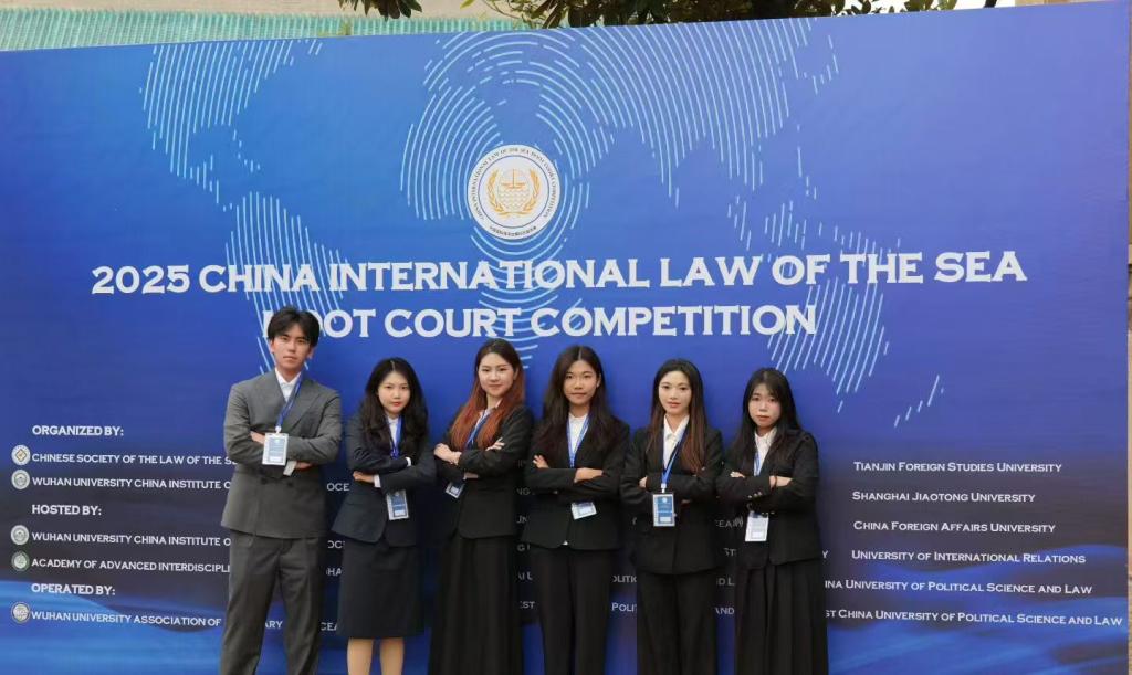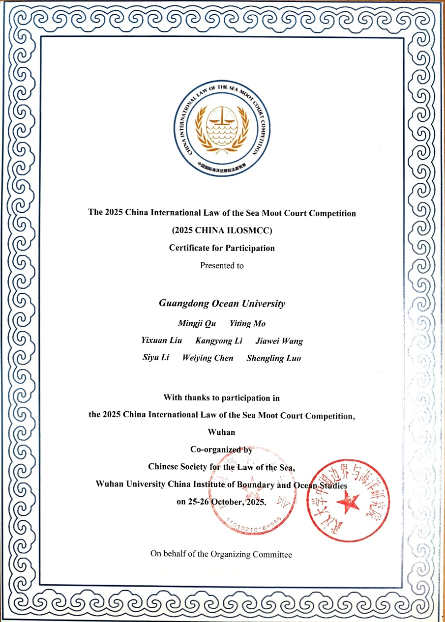 我校代表队由海洋法与国际法学系副主任曲明姬老师担任指导老师,法学1224莫逸婷担任学生教练,法学1231刘弋渲、法学1236王佳玮、法学1236李康咏和法学1242罗声玲担任庭辩员,法学1233陈伟滢和法学1236李思语担任研究员。依托我校鲜明的海洋特色优势,赛队成员在备赛期间充分发挥专业特长,针对复杂的海洋法案情进行了详尽的法律检索与梳理,查阅了大量国际法院及国际海洋法法庭的英文判例,夜以继日地撰写与打磨全英文诉状,为庭辩打下了坚实基础。