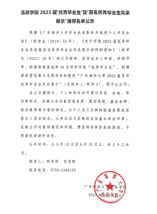 学生先进集体与先进个人评定办法》(校学生〔2019〕53号)、《关于评选2023届优秀毕业生及征集百名优秀毕业生风采展示材料的通知》(校学生〔2023〕20号)的文件精神,经学生本人申请、学院评审,拟推荐郭晨旭等48名同学评选“优秀毕业生”,拟推荐林雪花等8名同学材料报送“小说狂人