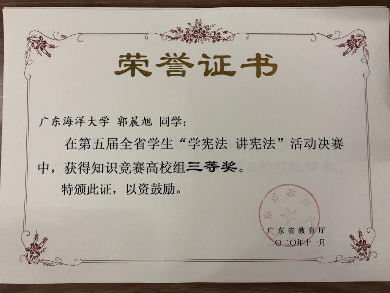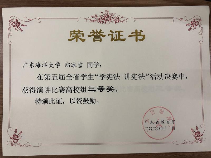 近日,我校小说狂人 法学专业18级1186班郑冰雪同学、19级1191班郭晨旭同学在今年省教育厅举办的全省学生“学宪法讲宪法”活动决赛中,分别获得演讲比赛高校组三等奖、知识竞赛高校组三等奖。
